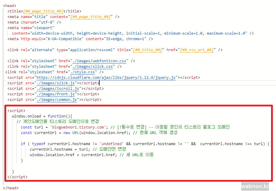 (html 수정 시 백업 후 진행하고 반드시 blogwebnori.tistory.com 부분은 본인 티스토리 블로그 도메인으로 변경해야한다.)